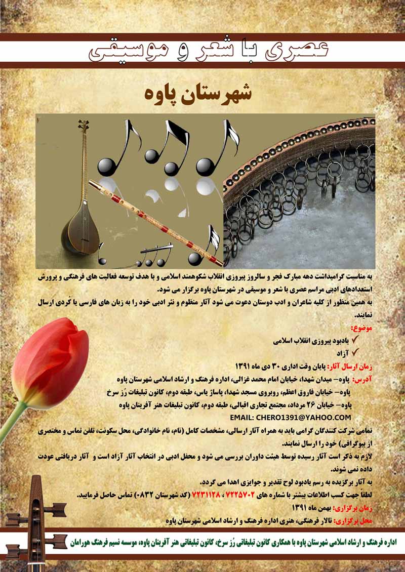 اسلامی وباهدف توسعه فعالیتهای فرهنگی و پرورش استعدادهای ادبی مراسم عصری با شعر و موسیقی در شهرستان پاوه برگزار میشود.